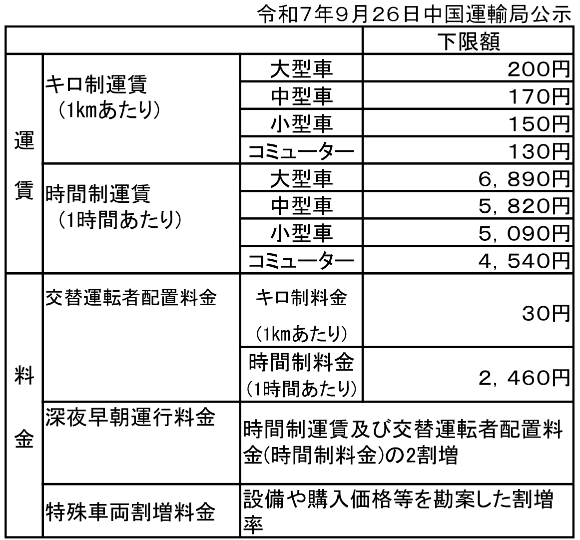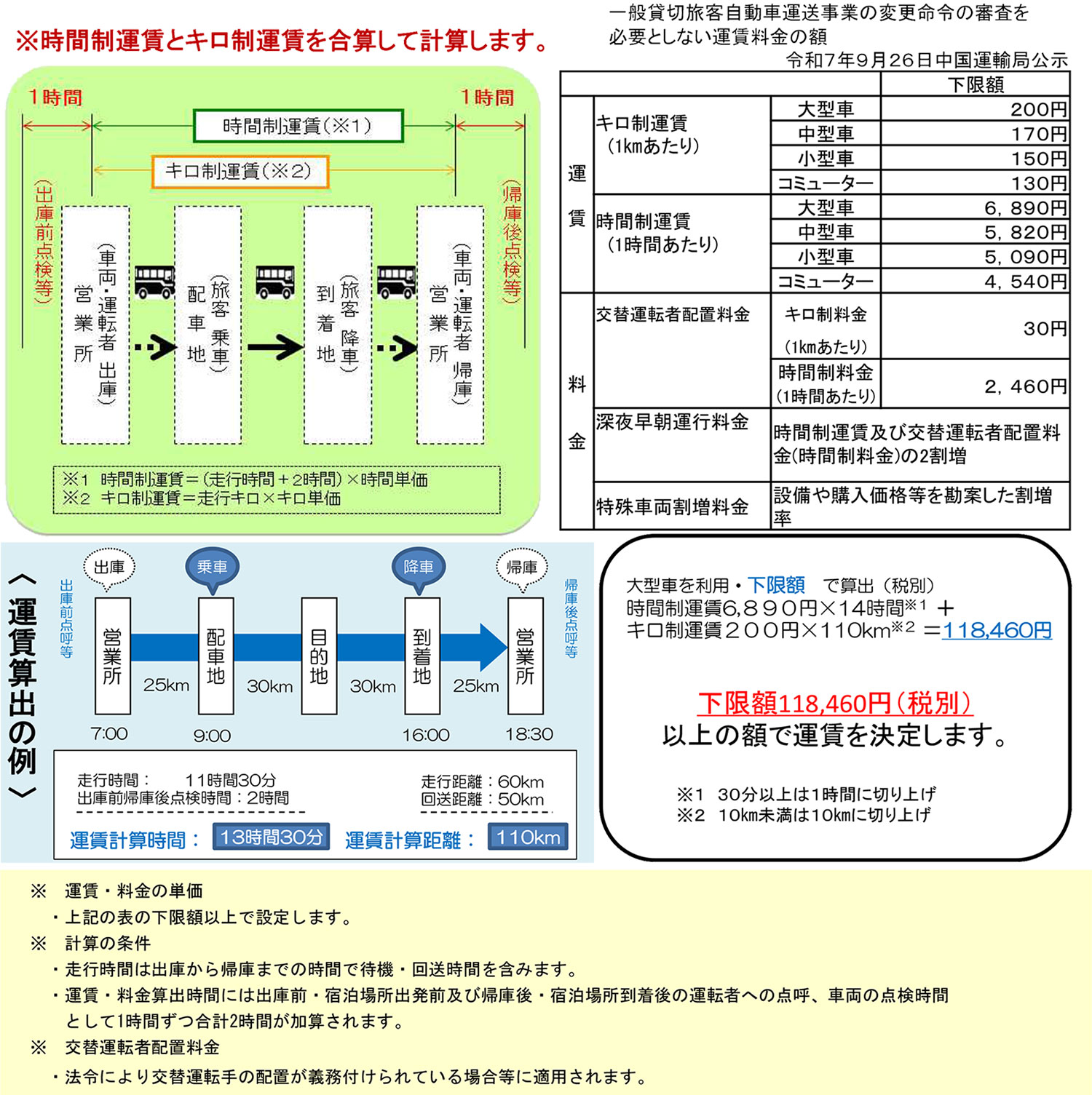 国土交通省中国運輸局公示(令和7年9月26日付)に基づく当社貸切バスの運賃及び料金は次の通りです。