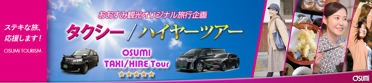 おおすみ観光オリジナル企画旅行「タクシー/ハイヤーツアー」は、少人数で安心してご利用いただける旅行プランを楽しんでいただけます。品質にこだわり、特に「食」へのこだわりは、お客様の期待に応えられる様、最善を尽くしたおもてなしで提供します。「ワクワク・ドキドキのご満足いただける旅づくり」を目指して、お客様の期待にご納得いただける旅行企画をご提案いたします。